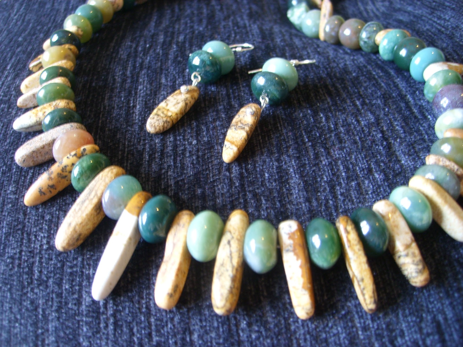 This pretty set is a contrast of colour, shape and texture: the picture jasper nuggets have an opaque, matt finish, and remind me of driftwood. Moss agate varies greatly in hue across the green spectrum, and some gems are opaque while others are partially transparent and have pretty, moss-like inclusions. They are polished to a glass-like finish that reflects light beautifully. I particularly like the earrings in this set, as the nugget shape drops hang nicely and give a very different look compared to regular bead shapes.
